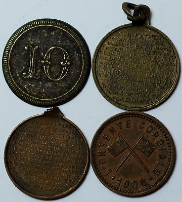 Lot mindre engelske medailler af messing og kobber, præget i anledning af forskellige royale begivenheder, bl.a. jetton af messing, slået i anledning af dronning Victorias bryllup, 1840. Ø. ca. 17 mm.