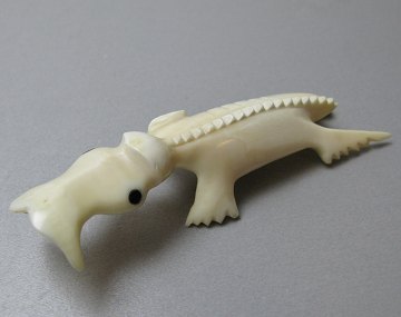 Grønlandica, tupilak i form af krybende øgledæmon, håndskåret af kaskelothvaltand, L. ca. 10 cm. Tupilakken er del af en større samling, indkøbt i 1970'erne hos KGH, Kongelig Grønlandsk Handel i Thule og Sdr. Strømfjord. Proveniens: tidligere ansat kontorass. hos DAC - Danish Arctic Contractors 1972-76 og 1978-80