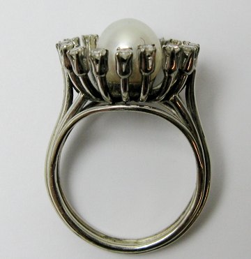 Rosetring af 14 kt. hvidguld med profileret skinne, prydet med 16 brillantslebne diamanter, tilsammen ca. 0,35 ct. samt flot kulturperle, 6½ mm. Ring str. 56, samlet vægt ca. 7,0 gr. Ringen er købt hos Guldsmed Frantz Hingelberg, Århus, i 1970'erne. Original salgsæske medfølger.