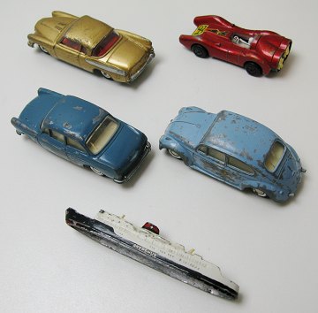 Lot med 4 legetøjsbiler og 1 modelskib. Tekno Nr. 819 og 828. VW 1200 og VW 1500, PILOT færge "Akershus", MATCHBOX Turbo Fury og GORGI Studebaker Golden Hawk. L. 10,5 - 7,5 cm.