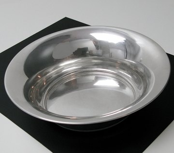 Konfektskål af sølv med glat korpus på riflet fod, foroven udbøjet riflet kant. Stemplet A.G., København 1950 og Jens Sigsgaards guardainstempel. Diam. ca. 17,5 cm., vægt ca. 150 gr.