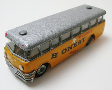 TEKNO VOLVO bybus nr. 850, modificeret med "Honest John" mærkater som nænsomt kan fjernes. L. 15,5 cm.