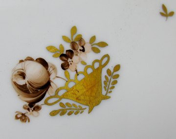 Royal Copenhagen "Golden Basket" asiet af porcelæn, dess 595, dekoreret med blomster i gylden kurv. 1. sortering, ca. 22 x 15 cm.