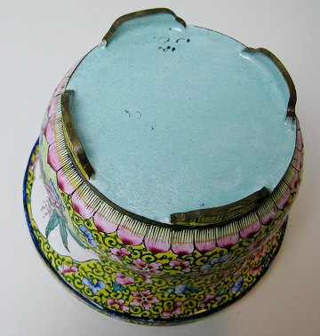 Gammel japansk skjuler af fajance med forstærkninger af metal, pragtfuld dekoreret med personer i en have samt omløbende, sirlig ornamentik. H. ca. 12 cm., Diam. ca. 17 cm. 20. årh. begyndelse.