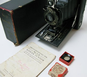 KODAK Junior bælgekamera model 1 A i original salgsæske fra tiden omkring år 1910. 139 mm. Anasticat optik og ekstra portrætlinse medfølger. Kamera i nedlukket stand ca. 22 x 11 cm.