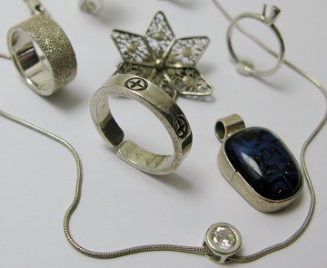 Lot diverse smykker af sølv, bestående af 6 diverse ringe, forskellige Str. 49 - 62 samt halskæde med simili, L. 42 cm., filigran broche og vedhæng med emailledekoration. Samlet vægt ca. 40 gr.