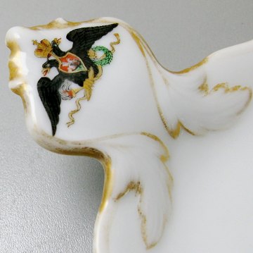 Russisk kaviarskål fra den Kaiserlige Porcelænmanufaktur i Skt. Petersborg 1902. Hank flot dekoreret med dobbelørn, krone og våbenskjold med Skt. Georg og dragen. Ydermere dekoreret med guldstaffering i form af bladværk. På bagsiden stempel fra den Kaiserlige Porcelænsmanufaktur i Skt. Petersborg samt dstostempel 1902. L. ca. 15 cm., Diam. ca. 11,5 cm.