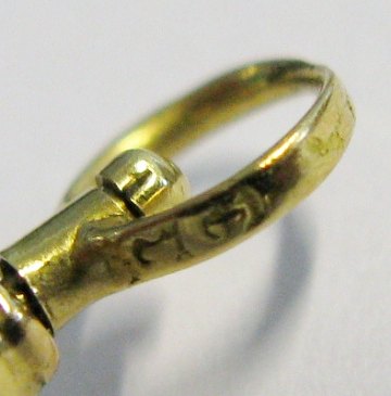 Empire lommeurnøgle af guld, stemplet B.S. og utydelig guldstempel. Tilskrevet Mester Benjamin Richard Schou, borgerskab 1842. L. med kædeøsken ca. 33 mm.