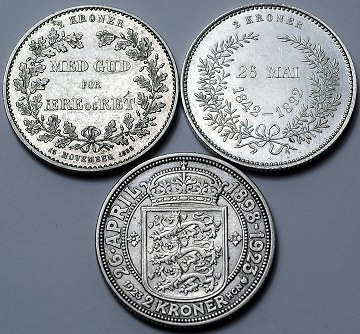 Lot danske jubilæumsmønter - 2 kr 1888, 1892 samt 1923