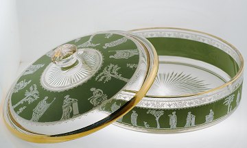 Lav lågkrukke af presset glas m. antikke motiver i Wedgewood-stil, guldkant og lågknop m. rester af forgyldning. Ø. 18 cm, H. 9,5 cm. 20. årh.