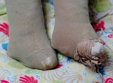 Dukke m. hoved af bemalet metal og krop er forstærket stof. L. 43 cm.