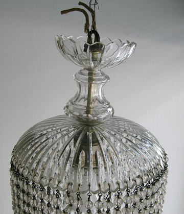 Antik lille rund prismekrone med top af massiv glas, pyntet med prismekæder, hver fjerde forneden afsluttet med prismedråbe. Fatning af messing og porcelæn. L. ca. 45 cm., Diam. ca. 22 cm. Proveniens: Tidligere hængt på en nordsjællandsk Herregaard omkring år 1870.