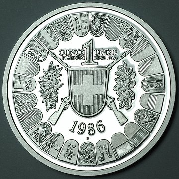 Schweizisk "schützentaler" af finplatin, præget i anledning af 700 året for den schweiziske samling 1291-1991. På fs. ses Wilhelm Tell og hans søn, og på bs. forskellige schweiziske våbenskjold. Ø. 39 mm.