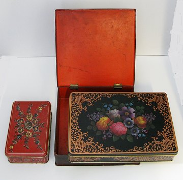 Lot bestående af lakæske med romantisk motiv, ca. 23 x 23 cm., samt Barringer, Wallis og Manners, Mainfield kagedåse med blomstermotiv, ca. 26 x 28 cm. og hollandsk dåse med blomstermotiv, ca. 17 x 11 cm.
