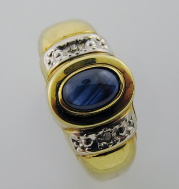 Ring af 14 kt. guld, prydet med cabochonsleben safir, ca. 6 x 4 mm. samt to mindre diamanter, tilsammen ca. 0,07 ct. Samlet vægt ca. 3,0 gr. Str. 57.