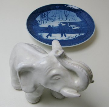 Royal Copenhagen juleplatte 1987 "Vinterfugle" og 1989 "Vinterleg ved Kastellet" samt to figurer i form af Budde-Lund hvidglaseret elefant, L. ca. 19 cm. samt umærket gravhund. Sidstnævnte med afslag på det ene øre.