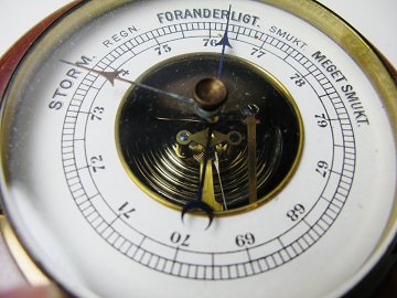 Barometer i ramme af poleret bøgetræ, indikatorskive med tal og streginddeling bag glas med messingkant. Bagsiden stemplet med borgtårn. Diam. ca. 14 cm. Danmark, 20. årh. begyndelse.