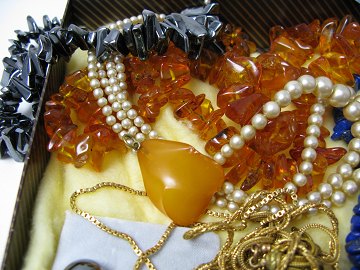 12 dele retro bijouteri fra 1970'erne bestående af ravvedhæng og ravkæde, Lapis Lazuli ring og halskæde, par øreclips og halskæde af blodsten, par armringe med emailledekoretioner, perlekæde og halskæde.