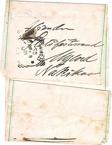 Danmark. 1891. 5 øre grøn korsbånd opfrankeret med 5 øre grøn våbentype og sendt fra Nakskov til Italien. Annulleret med togstempel LOLLANDSKE JB. PKT. Ualmindelig.
