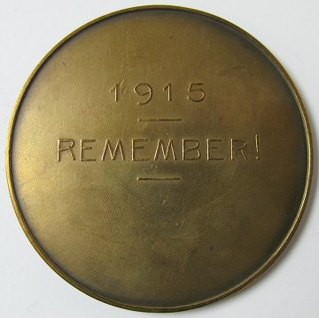 Engelsk medaille af messing fra 1. Verdenskrig, på fs. prydet m. portræt af to af datidens kvidelige idealer, Marie Depage og Edith Cavell, på bs. står "1915 - Remember!". Ca. 1915. Ø. 60 mm.