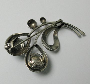 Herman Siersbøl broche af sterling sølv i form af stiliserede blomster, prydet med to lagungrønne månesten. L. ca. 5 cm., samlet vægt ca. 6,8 gr.