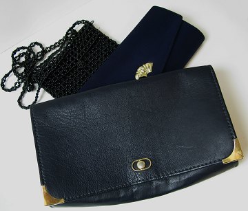 3 stk. forskellige retro teatertasker af henholdsvis midnatsblå skind, kongeblå stof samt sorte perler. Den største taske er ca. 28 x 20 cm. til sammenligning.