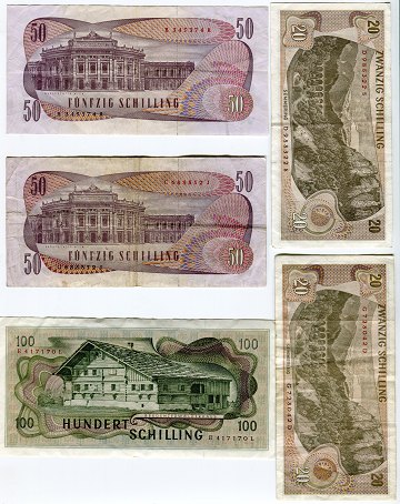 Samling Østrig på i alt 5 sedler. Østrig 100 Schilling 1969 - 2 x Østrig 50 Schilling 1970 og 2 x Østrig 20 Schilling 1967.