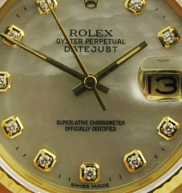 Rolex Oyster Perpetual Datejust herrearmbåndsur i kasse af 18 kt. guld. Perlemorskive bag safirglas med brillantbesatte stregindikationer, central sekundviser og datovisning i #3 positionen. President lænke med flip-lock ligeledes af 18 kt. guld. Urkasse Diam. ca. 36 mm. Vægt ca. 131 gr.
