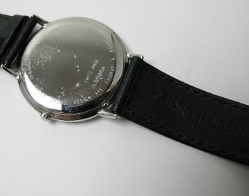 Georg Jensen, Thonderup & Borup herrearmbåndsur, design 375 i kasse af blankpoleret stål. Hvid skive med romertal, stregindikationer og central sekundviser. Quartsværk. Original GJ læderrem. Urkasse Diam. ca. 34 mm. Original salgsæske medfølger.