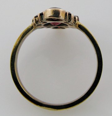 Ring af 8 kt. GULD, dekoreret med facetslebne granater i roset. Str. 53½, samlet vægt ca. 2,6 gr.