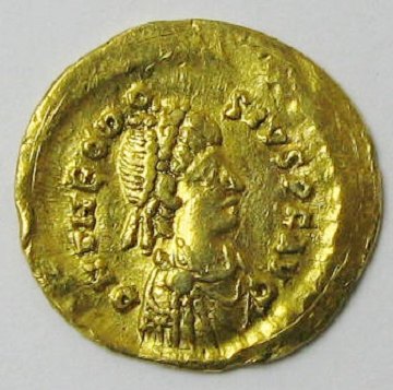 Interessant romersk guldmønt, præget under Justinian I, formentlig i Konstantinopel. Ø. ca. 14 mm.
