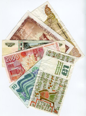 6 sedler Europa. Grækenland 1000 drachmer, Spanien 2000 og 100 pesetas, Sverige 10 kr, Irland 1 pund og Polen 10 zloty.