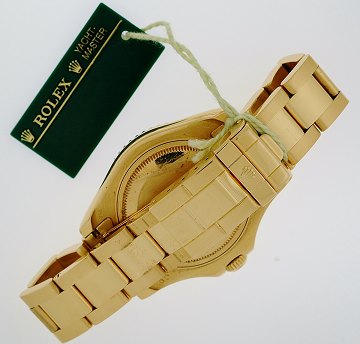 Midsizeur fra Rolex, model Yachtmaster, ref.nr.: 168628, F-serie, i kasse og m. oysterlænke af 18 kt. guld, hvid skive m. streg- og punktindeks, chronometerfunktion, safirglas, automatisk urværk. Ø. 35 mm.
