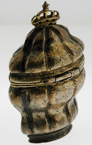 Hovedvandsæg af sølv, ligeknækket korpus m. ciseleringer og rester af forgyldning, top pryder med krone, punslet under bunden m. utydelige initialer. Uidentificeret mesterstempel indvendig i bunden. H. 6,6 cm.