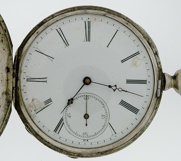 Herrelommeur fra M.J. Tobias, Liverpool, i kasse af poleret stål, prydet m. busteportræt af herre i profil (har en vis lighed m. Abraham Lincoln), hvid emaljeskive m. romertal og separat sekundviser, nøgleoptræk, ca. 1850. Ø. 52 mm.