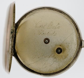 Lille herrelommeur i kasse af sølv, hvid emaljeskive m. romertal hvorpå "Carl Dela, Thisted" er skrevet, serarat sekundviser, schweizisk optræksværk. Ø. 47 mm.