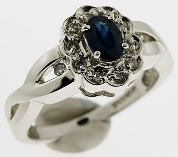 Ring af 14 kt. hvidguld m. flettet skinne, prydet m. facetteret safir, hvilken er omkranset af 10 brillantslebne diamanter på ialt ca. 0,05 ct. Str. 53/53 1/2.