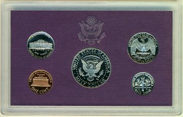 Ucirkuleret møntsæt slået i proofkvalitet, bestående af Kennedy-half dollar, Washington-quarter, Roosevelt-dime, Jefferson-nickel samt Lincoln-cent. Samlet i etui fra U.S. Mint.