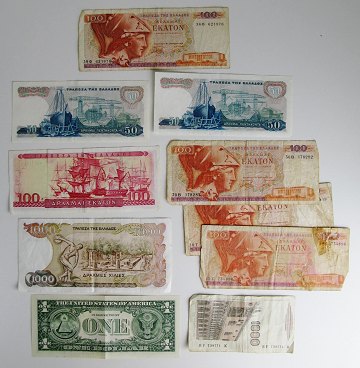 Grækenland, 3 stk. 100 Drachmer, 2 stk. 50 Drachmer, 1 stk. 100 Drachmer samt 1 stk. 1000 Drachmer. Herudover medfølger 1 U.S. Dollar og 1000 italienske Lira.