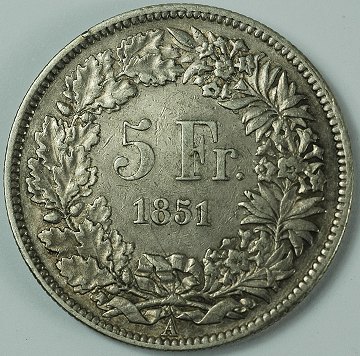 Schweiz, 5 francs SØLV 1851A - KM 11