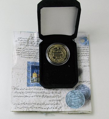 Islam historisk mønt, udgivet i samarbejde med hans hellighed Imam Aili ibne Mussa el-Reza. 18 kt. forgyldt zink, præget med ord fra koranen. Diam. ca. 38 mm., fremstillet i det 20. århundrede.
