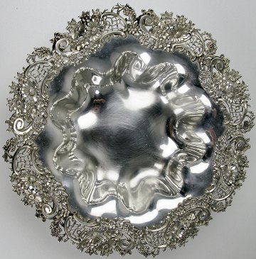 Skønvirke skål af sterling sølv med glat korpus, drevet med bukler. Kant rigt dekoreret med gennembrudt volutte, ranke og blomstermotiv. Diam. ca. 22 cm. Vægt ca. 257 gr.