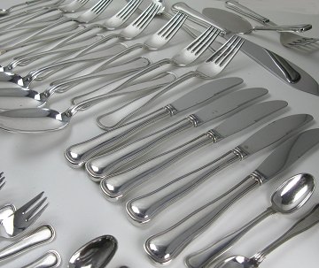 Cohr, dobbeltriflet bestik af sølv bestående af 5 middagsknive, 7 middagsgafler, 6 middagsskeer, 12 kagegafler, 10 théskeer, 1 marmeladeske, 1 pålægsgaffel, 1 paletteske, 1 kagespade, 1 kartoffelske samt 1 lagkagekniv. 46 dele i alt.