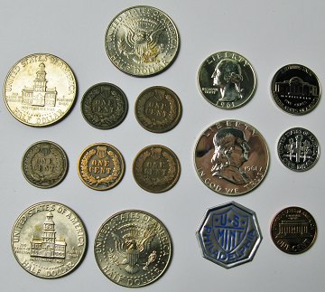 Lot mønter U.S.A. bestående af 4 stk. halfdollar, 5 stk one cent samt Philadelphia møntsæt. Sidstnævnte ucirkuleret.
