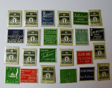 Lot reklame frimærkepenge, 1 øre Danmark, i alt 24 stk.