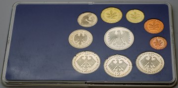 Tysk møntsæt, hvor mønterne er slået i proof-kvalitet, bestående af: 1, 2, 5, 10 og 50 pfennig samt 1, 2(3) og 5 mark.