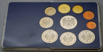 Tysk møntsæt, hvor mønterne er slået i proof-kvalitet, bestående af: 1, 2, 5, 10 og 50 pfennig samt 1, 2(3) og 5 mark.