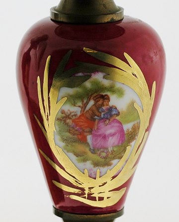 Et par dekorative støbte stager af messing og porcelain, bemalet med klassiske scenerier. H. 15,5 cm.