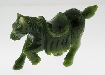 Smuk figur af udskåret mørkegrøn jade, udført som sadlet hest, Kina 19./20. årh. L. 7,5 cm.