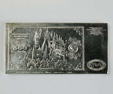 Tysk sølvbarre, præget i anledning af 20 års dagen for indførelsen af D-Mark (20.6.1948 - 20.6.1968) Certifikat fra Mekur-Bank München, nr. 004190 samt salgsæske medfølger.